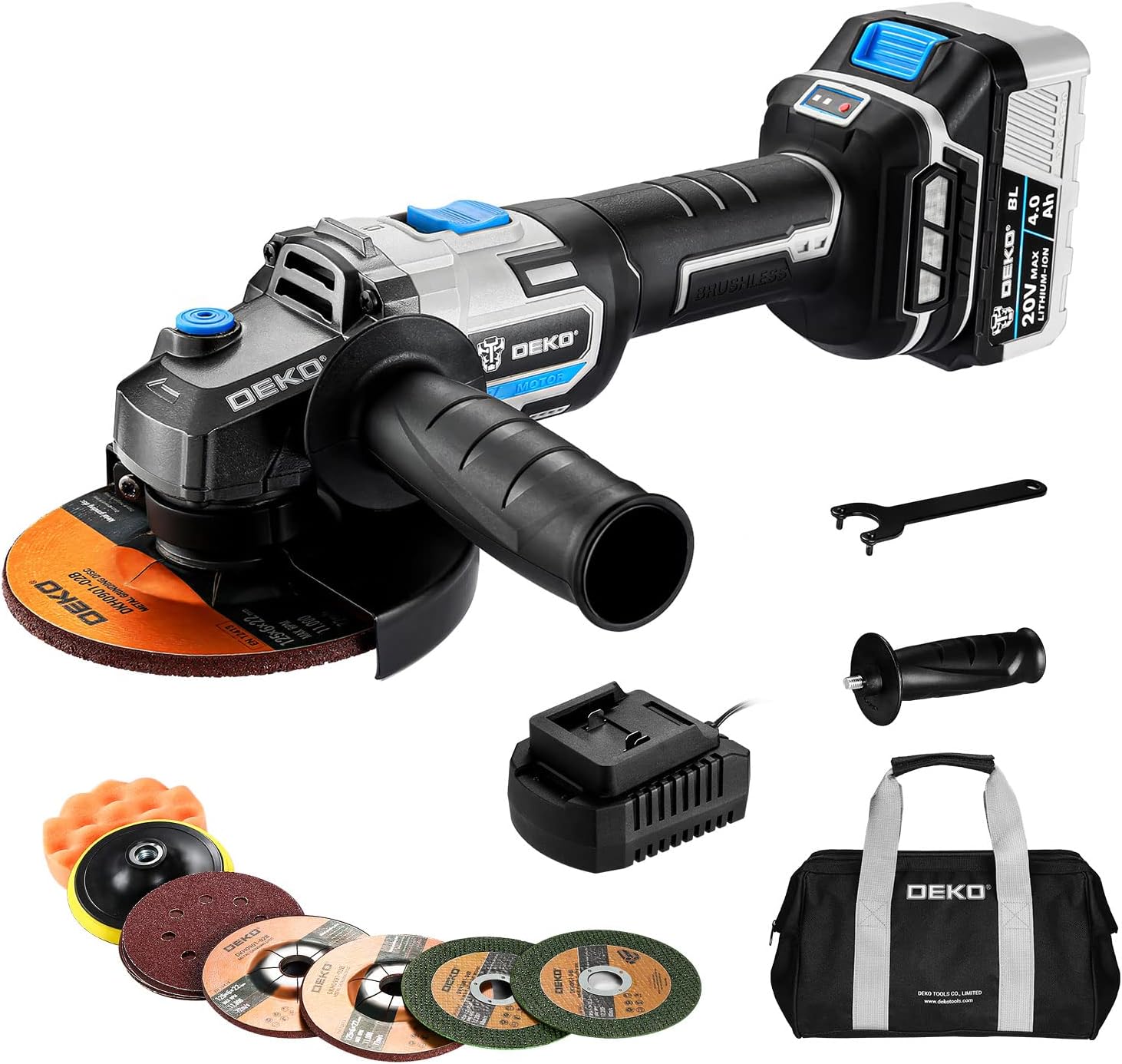 DEKO Cordless Angle Grinder, Cordless Angle Grinder 4.0Ah Battery Charger, 8500RPM , Auxiliary Handle, Suitable for Metal Wood