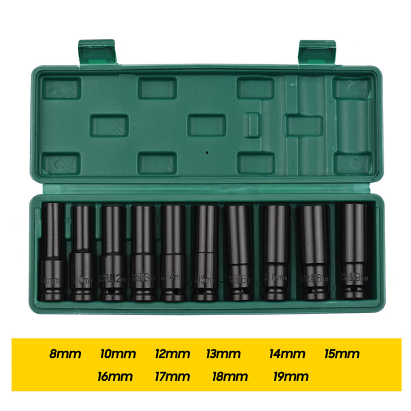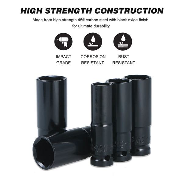 En Çok Kullanılan Boyutlar Dahildir - Set, 1/2 inç tahrikli yüksek torklu darbeli soketleri (metrik) içerir: 10 mm, 12 mm, 13 mm, 14 mm, 15 mm, 16 mm, 17 mm, 19 mm, 22 mm, 24 mm ve 80 mm uzunluğunda.