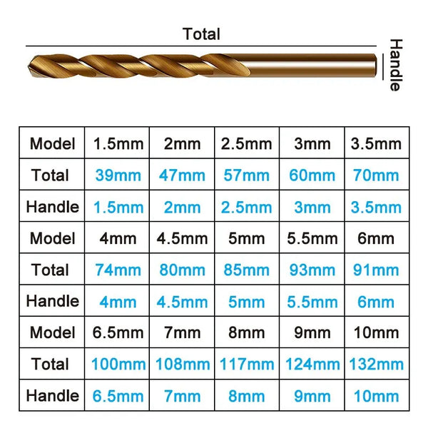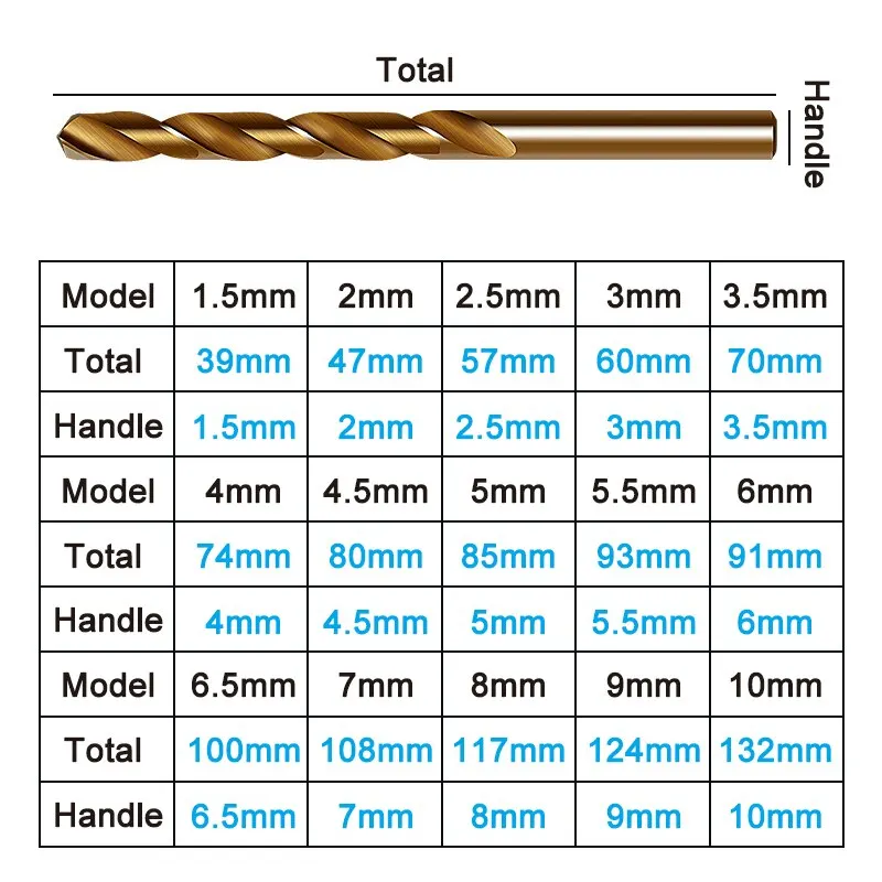 • 1,5-10 mm yüksek hızlı çelik tam taşlama deliği açma alet seti: 1,5 mm'den 10 mm'ye kadar çeşitli boyutlarda olan bu matkap ucu seti, çok çeşitli delik boyutlarını işleyebilir ve bu da onu her alet kutusu için değerli bir ek haline getirir.